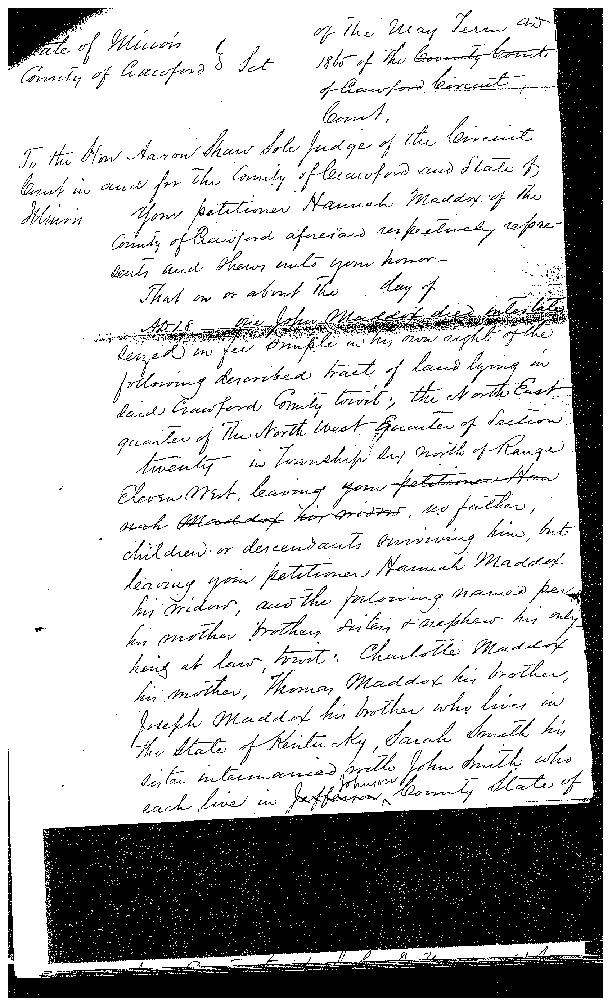 Benjamin Maddox (III), 1776-1855 31 Wednesday Jul 2013 Original size at 612 × 1008 ≈ Leave a comment An 1865 Crawford County, Illinois, petition showing that Charlotte is Joseph’s mother. Like Loading...